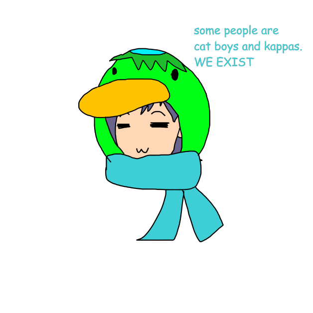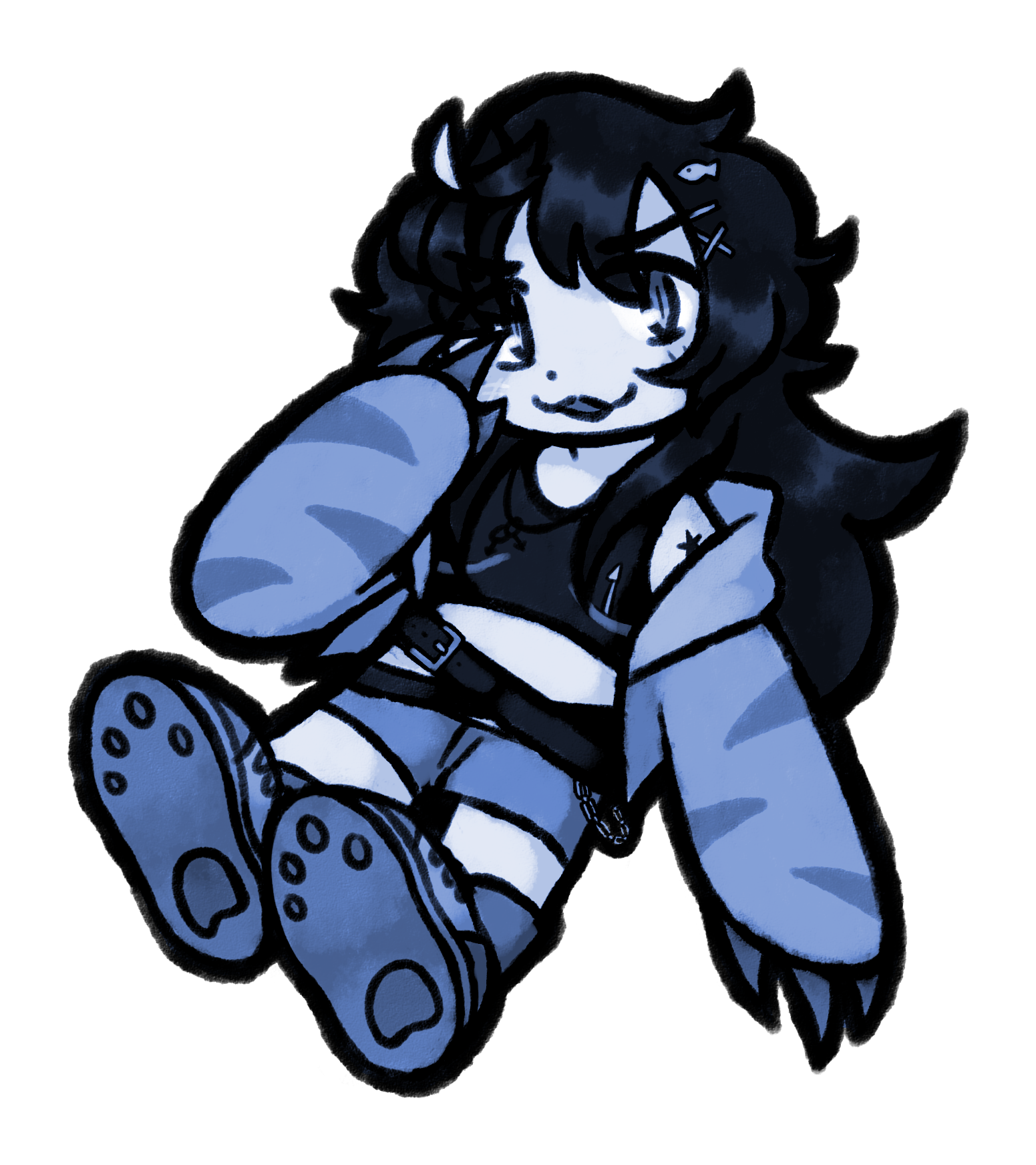 Section titled “Appearance”A chubby 21-year-old white guy. He has purple-tinged black mullet that runs to the base of his shoulder blades, the top layer just short of chin length. He has a white ahoge on the right side and wears hair clips on the left, including a fish shaped one. He has a scar on his cheek and blue triangles painted to point at his eyes; three on each side. He has green-yellow eyes. He has long nails, painted in a mix of blue, grey, and black. He wears a black tanktop with blue claw-like stripes on the shoulders, and zippers on the nipples. He wears a mlm necklace. He wears khaki green shorts with two black belts and a long chain. He’ll sometimes wear a grey zipper hoodie with tiger paw sleeves that have blue stripes. He wears grey and blue trainers. He has a seven sisters emblem tattooed on his left arm. 185cm tall.